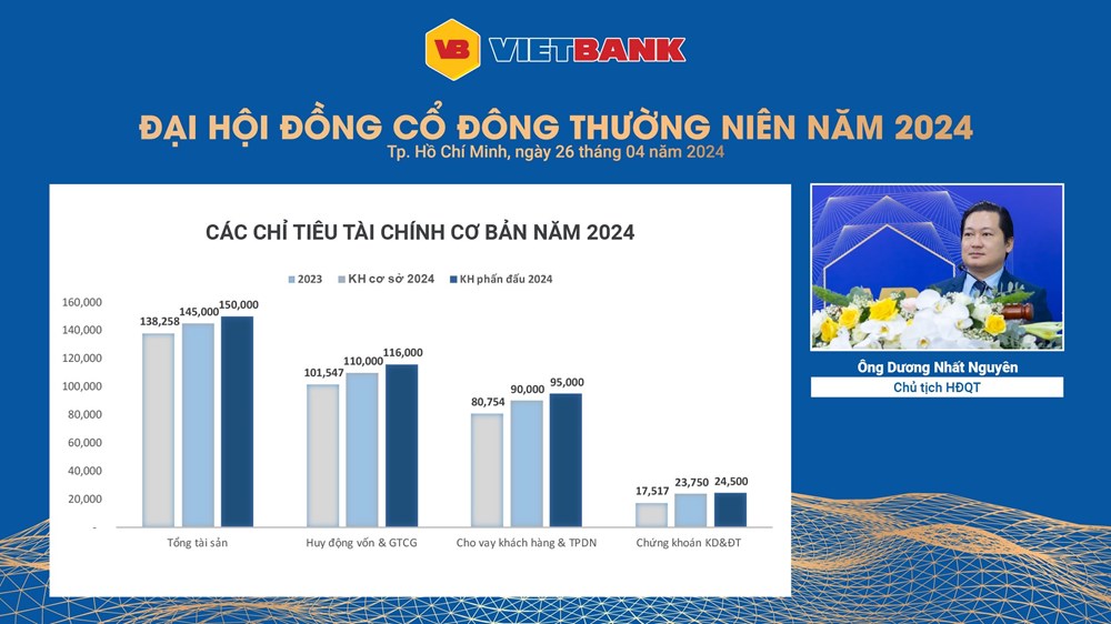 Ngày 26/4/2024, Ngân hàng TMCP Việt Nam Thương Tín (Vietbank - VBB ) tổ chức thành công Đại hội đồng cổ đông (ĐHĐCĐ) thường niên bằng hình thức trực tuyến. Năm 2024, Vietbank hướng đến mục tiêu tăng trưởng lợi nhuận trước thuế đạt 29% và kiểm soát nợ xấu ở mức dưới hoặc bằng 2,5%.